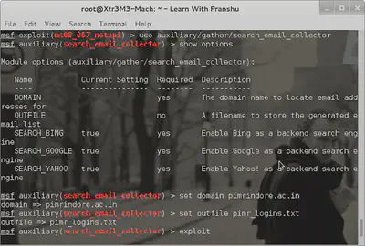 For the purpose of mass spamming or spear phishing, hackers use a module available in Metasploit that pulls email accounts of a particular organization from ‘Google’, ‘Bing’ and ‘Yahoo’.