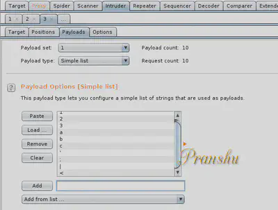 Now time to set the ‘Payload’, that is, what that random data is going to be. For test purposes, I used a simple list where I inserted payload manually. You can use various fuzz lists available on the Internet.