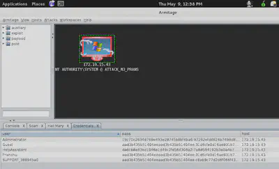 Now I can see this windows XP host in Armitage workspace. From here, I could manually search for vulnerabilities on the Windows XP and then try to exploit them, but I chose the easy way on Armitage, which is ‘Hail Mary’.