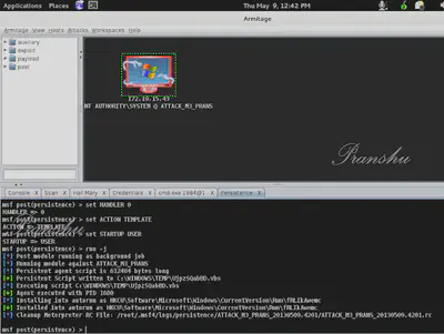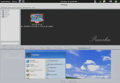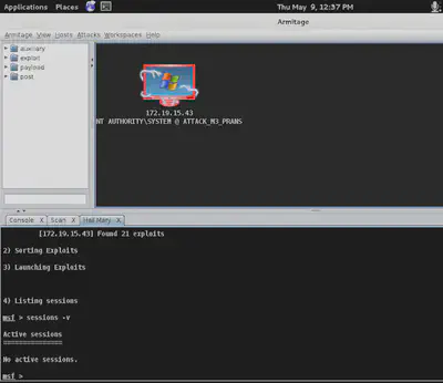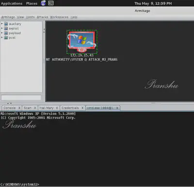Here, I am simulating an attack on a Windows XP system using Armitage on Kali Linux.