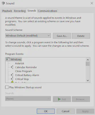 Over here, play the different sounds (‘Test’) and locate the source of the sound that you want to turn off. In my case, it was the Asterisk sound that originated from ‘Windows Background.wav’. I tried to select ‘None’ for asterisk and apply the setting but the sounds would still play for other events. I wanted to completely get rid of that sound ‘Windows Background.wav’. Therefore, I decided to just delete the source of the sounds – the WAV file itself.