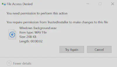 The WAV file is located in C:/Windows/media/. However, Windows would not let me simply delete the file since it is owned by ‘TrustedInstaller’.