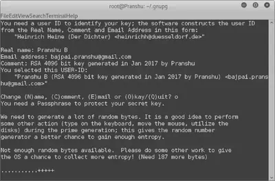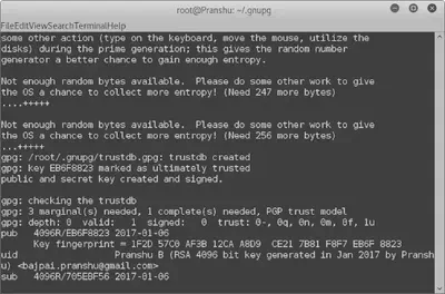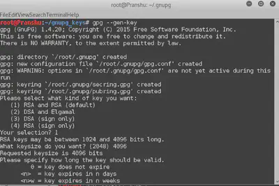 This post is meant to simplify the procedure for generating GNUPG keys on a Linux machine. In the example below, I am generating a 4096 bit RSA public private key pair.