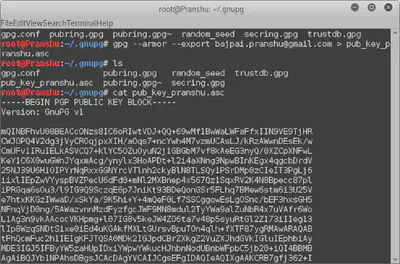 ls should now show you a new file in the folder called pubkey.asc. Now cat will show you that this is the public key file.