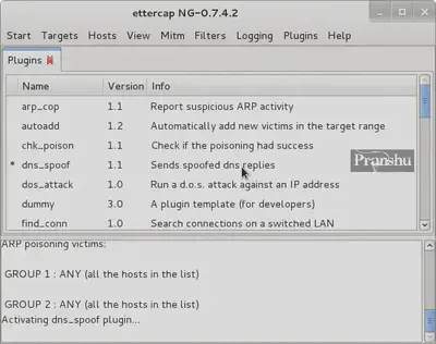 Then load up “ettercap –g” and goto Plugins -> Manage the Plugins -> double click DNS Spoof plugin. Make sure you see the ‘*’ next to it