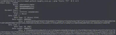 This loop prints the details of all blocks contained within the blockchain. Next, we can grep for the naughty/nice score in the output to spot anomalies (we know that J. Frost manipulated his score to be quite high).