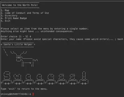 The challenge is to launch bash from the within the content of the running shell script. It provides 5 options as shown below and hints that entering special characters in option 4 (entering name) has unintended consequences. So we tried ; for terminating previous command and enter the new command bash to launch bash as asked. We are successful in exploiting a command injection vulnerability.