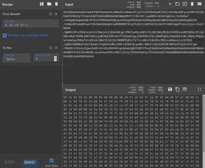 The magic number 50 4B (PK in ASCII) corresponds with archives. There is a strong likelihood that this is an archive. We obtain the corresponding hex in Cyberchef as shown above and construct a file from this data. xxd can be used for this purpose but to make things easier, we simply copy and paste the hex data that we obtained from Cyberchef above to hexed.it and then download the corresponding file.
