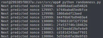 Now we can see the next series of predicted nonces and verify that 129996 was predicted correctly. Take note of the one for 130000 and that is our flag.