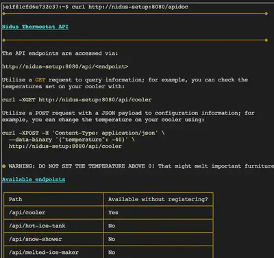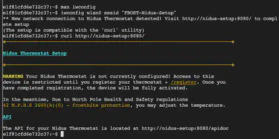 The message now tells us that we’re connected to the thermostat and points us to an HTTP endpoint to complete setup: http://nidus-setup:8080/. We visit this HTTP link using curl.