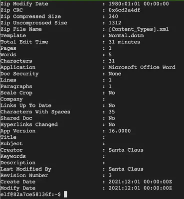 Since exiftool is installed, we can check the metadata on all available documents. For instance: exiftool 2021-12-01.doc brings up all kinds of interesting metadata on the file: