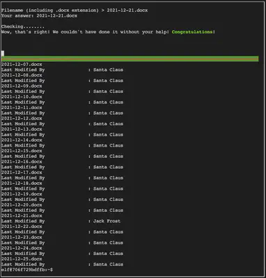 The “Last Modified By” field is of interest to us since we want to ensure modifications were not performed by an unauthorized party (Jack Frost). Now, we could check each file’s metadata manually, however, it is easier to run exiftool in a loop and grep for “Last Mod” as shown below: