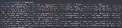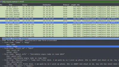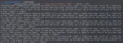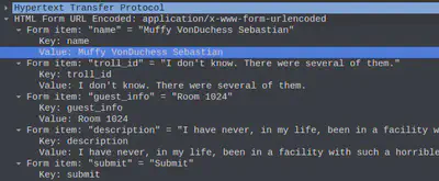 Now, we clearly see and can easily read all the complaint data. One complain stands out since it’s submitted by a human by the name of “Muffy VonDuchess Sebastian”. This is probably the human that joined the Jack Frost Tower network. We need to find out which trolls complained against this person. We can do so by observing this human’s room number.
