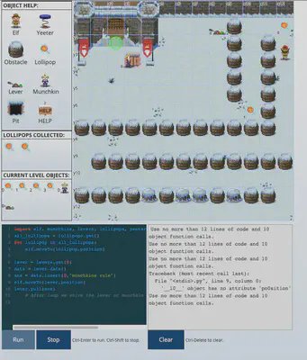 This challenge was a general introduction to Python classes, objects, functions, for loops and data structures. Basically, we are required to move elf, solve levers along the way, avoid traps, and get the elf to the Kringle castle entrance. All within a limited lines of code and object function calls.