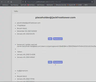 So we enter the same contact details twice and after the second time, when we see the message that the email already exists, we visit the path to the dashboard (https://staging.jackfrosttower.com/dashboard) and we are authenticated.