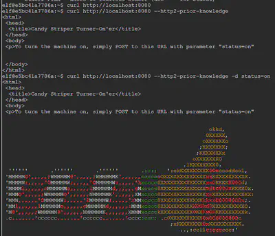 We know that the candy striper machine can be turned on by sending a request to port 8080 on localhost (127.0.0.1). But we do not know what request to send. To investigate further, we send a generic request for the URL localhost at port 8080. We weren’t able to get an intelligible response to this request. Recall that Holly Evergreen hinted at HTTP2. We use the --http2 option in curl to see if we can get an intelligible response. No good. So we try again with the --http2-prior-knowledge option and are able to get a readable response from the server. This response tells us that we simply need to make a POST request with the parameter status set to on.