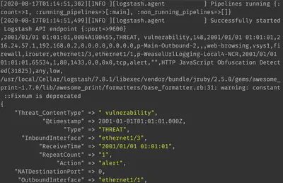 For our tests, we will use stdin as the log input. In the production environment, a log forwarding profile set on the firewall will direct logs towards the logstash endpoint and therefore will include a more complex input plugin that might include TLS protection using the logstash tcp input plugin. However, during testing, our input is simply: