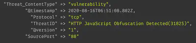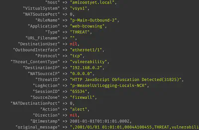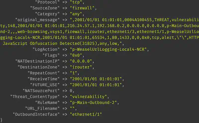 ,2001/01/01 01:01:01,0004A100455,THREAT,vulnerability,148,2001/01/01 01:01:01,216.24.57.1,192.168.0.2,0.0.0.0,0.0.0.0,Main-Outbound,,,web-browsing,vsys1,firewall,irouter,ethernet1/3,ethernet1/1,p-Logging-Local-Profile,2001/01/01 01:01:01,65534,1,80,1433,0,0,0x0,tcp,alert,"",HTTP JavaScript Obfuscation Detected(31825),any,low,