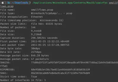 capinfos is a CLI tool that ships with Wireshark and can be useful to derive quick insights about the PCAP. It resides in the Wireshark directory, same as tshark and reordercap – the other CLI tools that ship with Wireshark. In my case (MacOS), capinfos was found here: