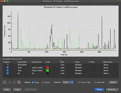 Next, it is good to build a timeline of traffic activity and fortunately Wireshark has I/O graphs for this purpose.