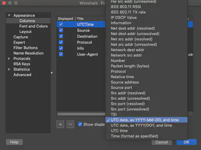First, create a new column in Wireshark (in this case UTCTime):