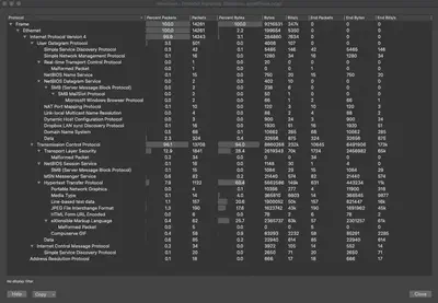 We therefore immediately see that this packet capture ran for a few minutes, with the first and last packet seen 5 minutes apart. Data byte rate suggests that the network was not under heavy load during the time.