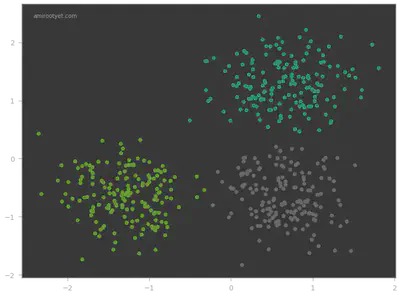 The array X contains $(x,y)$ coordinates for the generated data points, whereas y_true stores the true cluster numbers. We’ll use y_true later to see how our clustering algorithm performed against this dataset.